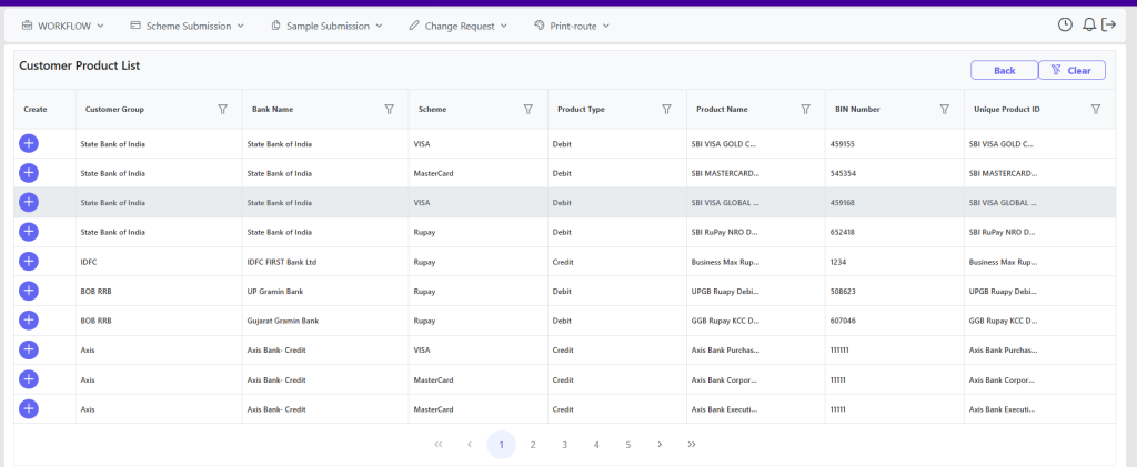 In this screen, customer and product details such as Customer Group, Bank Name, Sales Office, Licensing Authority, BIN Number, and Card Technology fields are displayed for selection or confirmation. Users define complete card specifications, including product category, form factor, hologram, magnetic stripe details, signature panel, and personalization options.