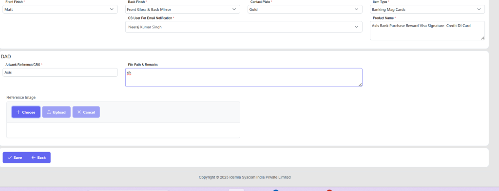 In the Artwork section, users enter the Artwork Name, Artwork Reference/CRS, select card body and material details, and upload reference images or supporting files. Users can also select CS users for email notifications.