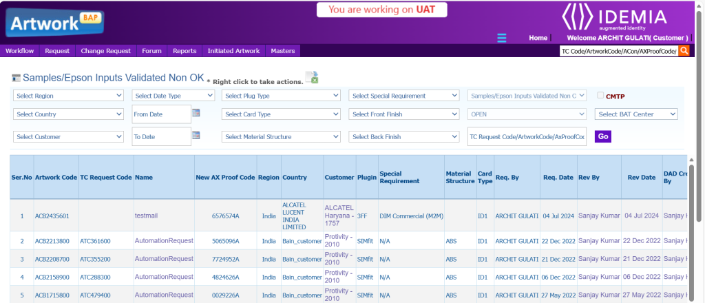 All Pages Artwork Main Expand Artwork Main Collapse Artwork Main Workflow Customer Actions Artwork Request Reviewed Non-OK Delivery Pending For Validation Samples/Epson Inputs Pending For Validation Customer Views Artwork Request Pending For Review Artwork Request Review OK Delivery Validated OK Delivery Validated Non-OK Samples/Epson Inputs Validated OK Samples/Epson Inputs Validated Non-OK Request Change Request List History Discarded Artworks Updated AX Proof Code Forum Reports Artwork Overview Artwork Summary Hold / Unhold Logs Initiated Artwork Masters Samples/Epson Inputs Validated Non-OK Updated on December 12, 2025 Once DAD is validated not ok, in case samples/inputs are there but not correct, it is rejected and sent back.