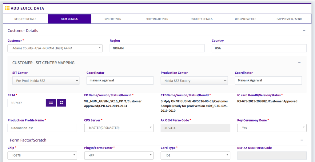 - AX OEM Perso Code > Unique 7-digit code needs to be filled every time we create a BAP request.