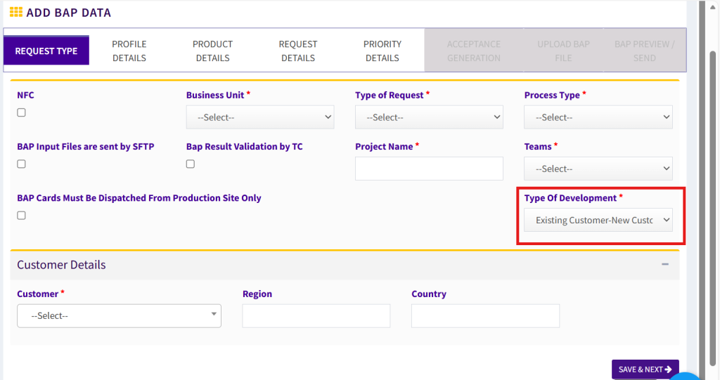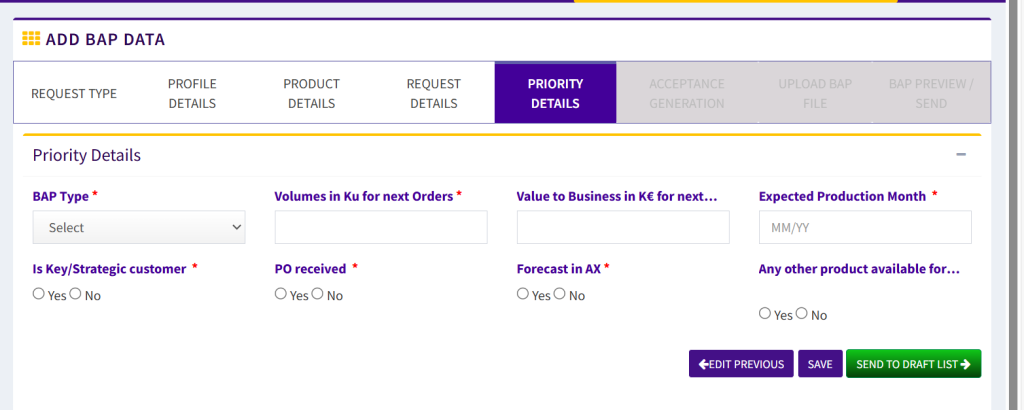 - Type of Request > Type of Request for the BAP must be selected from dropdown (Options: Customer Request, D2C & Chip Migration, and Test / Prototype / Proof of Concept (BAP not eligible to mass production).