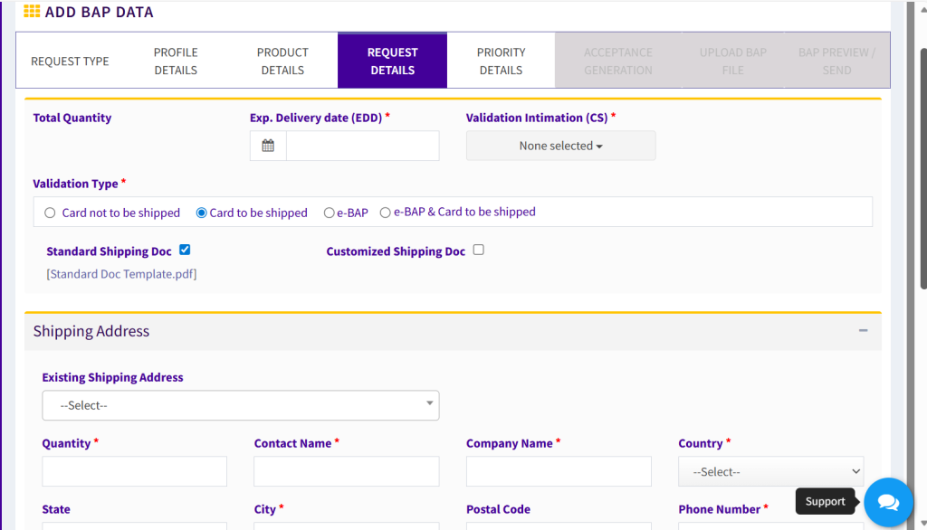 - Validation Type > “Cards not be Shipped” has to be selected when no cards have to be shipped to customer. “Cards to be Shipped” has to be selected when physical BAP cards have to be shipped to customer. ‘e-BAP’ in case electronic BAP is needed or ‘e-BAP & Card’ in case electronic BAP and physical BAP Cards both are needed. TC has also to fill Shipping address details in case he opts for Cards to be Shipped.