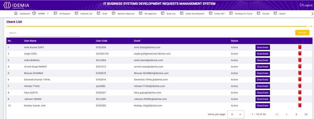 Each record includes the User Name, User Code, Email ID, and Status (Active/Inactive). An action option is provided to Deactivate users when required. The Search functionality allows quick filtering of users based on name, user code, or email.