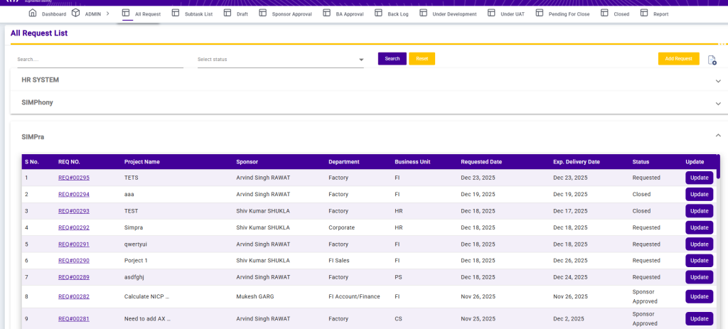 The All Request List page provides a centralized view of all project requests across different systems (HR SYSTEM, SIMPhony, and SIMPra). It allows users to easily search, filter, and manage requests.