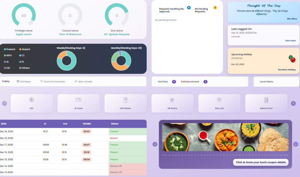 - Displays a “Thought of the Day” message to promote positivity, motivation, and employee engagement.