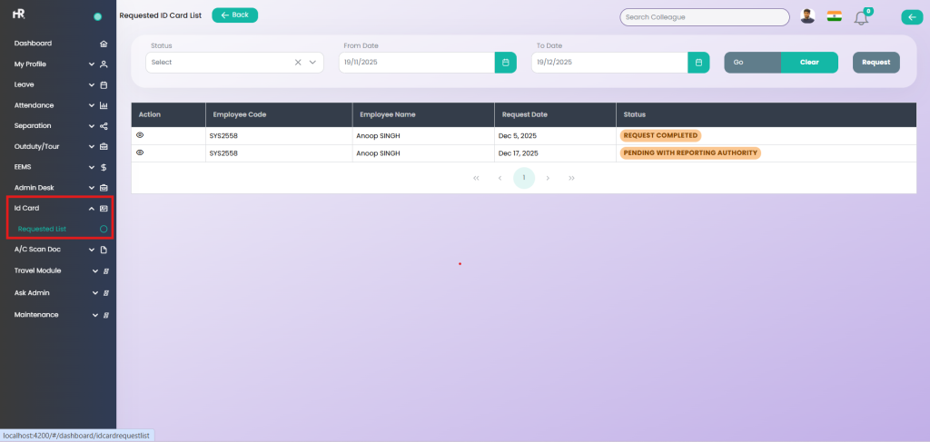 - The employee initiates an ID Card Re-Issuance Request.