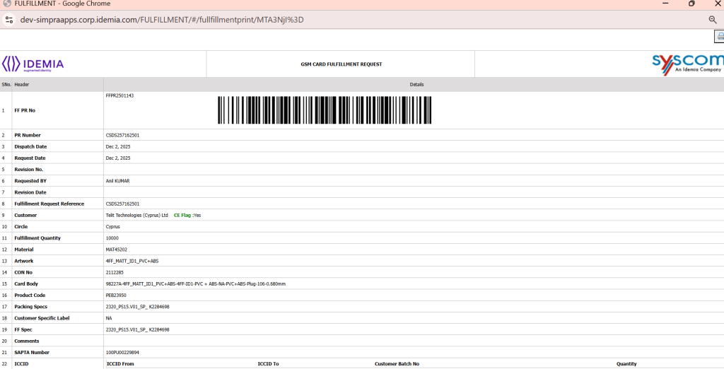 All Pages Fullfillment Expand Fullfillment Collapse Fullfillment Perso Order Fulfillment List: FF Perso View: FF Perso Print: Material Stock Request Pending Batch List : FF Perso Batch Entry: Pending FF Perso Batch Print FIM Link Batch List Fulfillment: FF Perso Batch ICCID Linking Stock Request FF : Pending Stock Request List: Stock Request Entry: Request List: Stock Issue Pending Issue List : Issue List : Stock Receive Pending Receive List Receive List Production Batch List Production List: Pending Receive List Warehouse Receive List Pending FF Perso Batch Print Updated on December 10, 2025 Here you can print FF perso data .