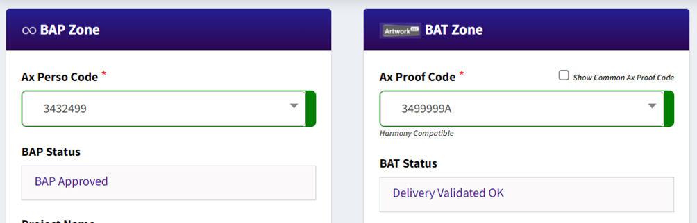 - If Artwork Compatible done on any request combination, then while creating Harmony Request, BAT Compatible will be displayed under Ax Proof Code Dropdown