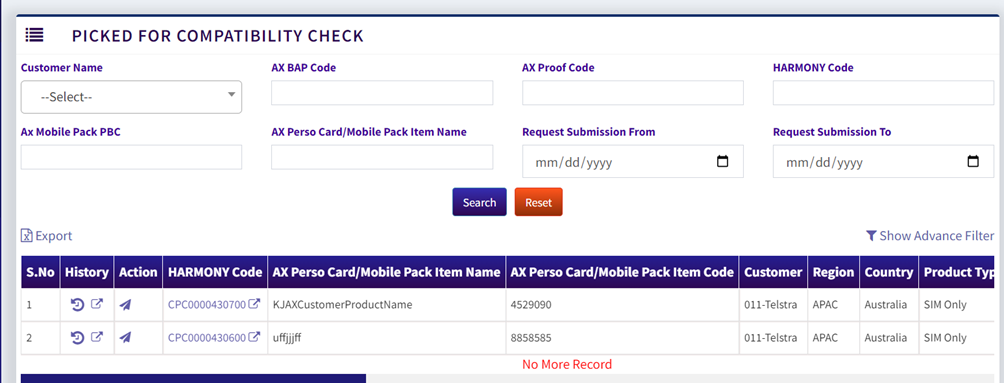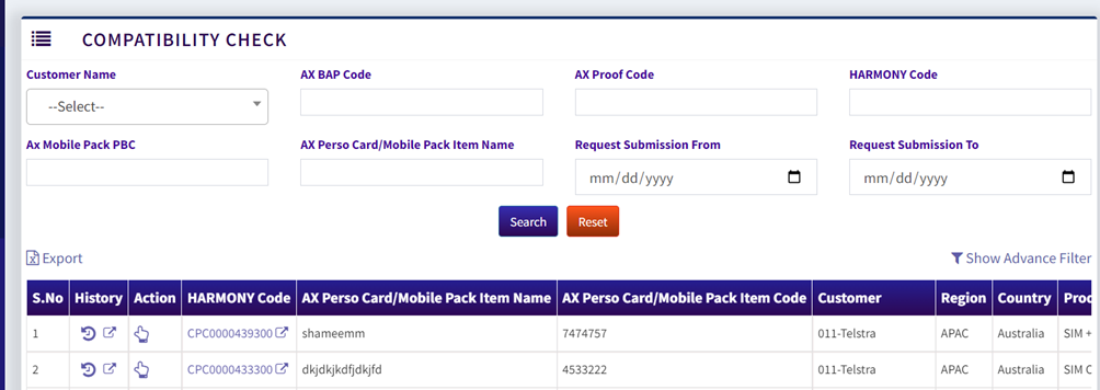 - If Harmony Compatibility has been done on Request with respect to both AxPersoCode and AxProofCode then while creating Harmony Request, Request will go live directly with Green in Symbol on both Ax Proof Code and Ax Perso Code