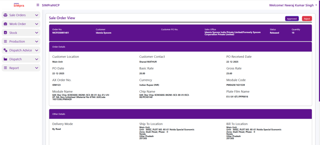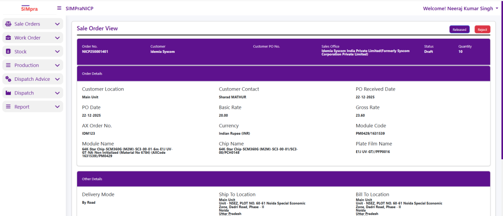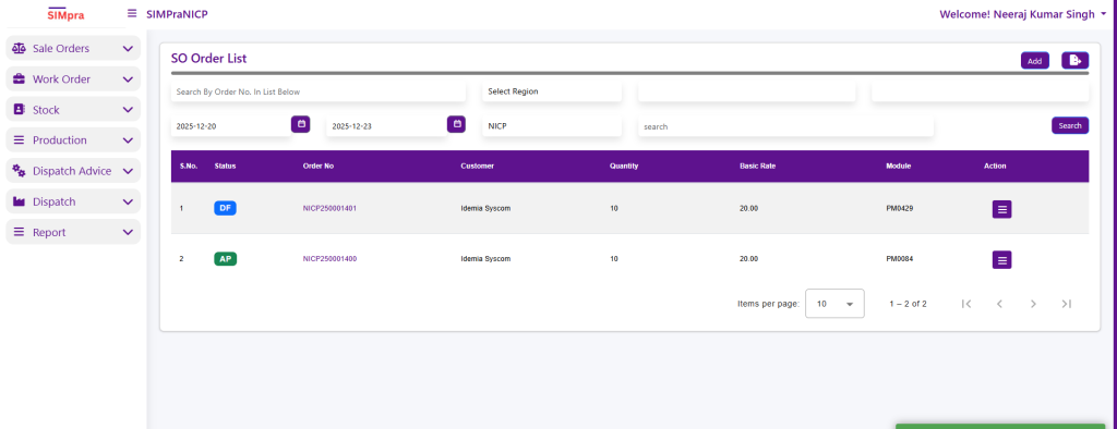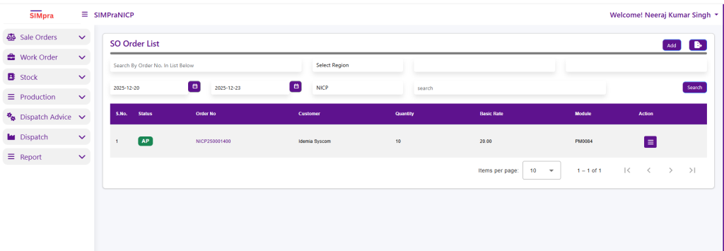 The Sale Order List in NICP displays all sales orders based on selected region and date range. Users can search orders using the Order Number for quick access. The list shows key details such as Order Status, Order Number, Customer, Quantity, Basic Rate, and Module. The Action column allows users to view or process the selected sale order. This screen helps in quick tracking and management of sales orders.