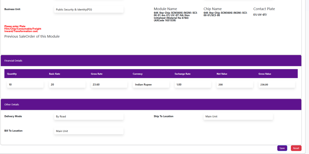 The Product Details section allows selection of Sales Product, Module Account, Module, Business Unit, and related product information like Module Name, Chip Name, and Contact Plate. In Financial Details, users enter Quantity and Basic Rate, after which the system calculates Gross Rate, Net Value, and Gross Value based on currency and exchange rate.