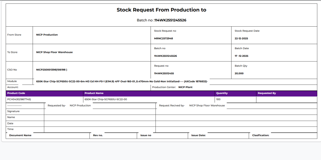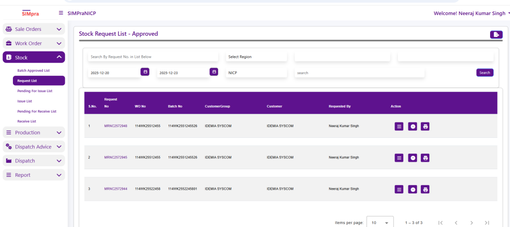 The list shows key details such as Request Number, Work Order Number, Batch Number, Customer Group, Customer, and Requested By. It also provides product information, including Product Name, Product Code, and Requested Quantity. From this screen, users can track approved stock requests and proceed with further stock issue .