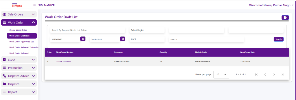 The Work Order Draft List displays work orders that have been created but are still in draft status. Users can search by Work Order Number, filter by Region and Date Range, and review basic details such as Customer, Quantity, Module Code, and Work Order Date.