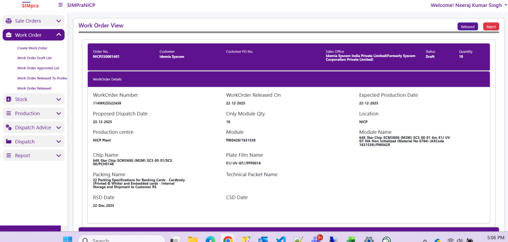 This screen is used to release and approve work orders, allowing authorized users to verify the details and move the work order to the next stage of the production process.