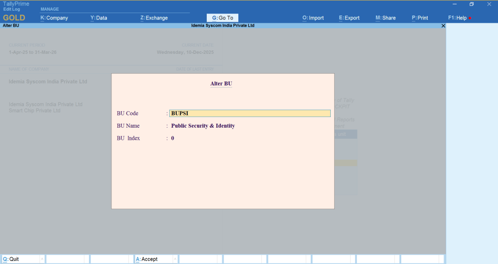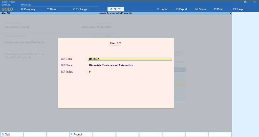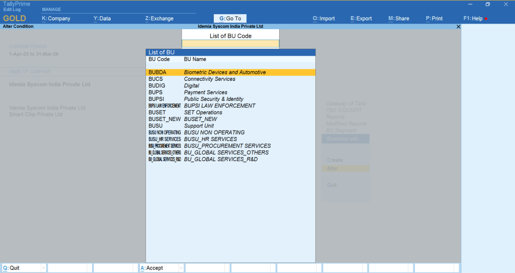 BU Master allows segregation and analysis of financial data by business units for better reporting and decision-making. It is a customized master format containing name and code for each unit