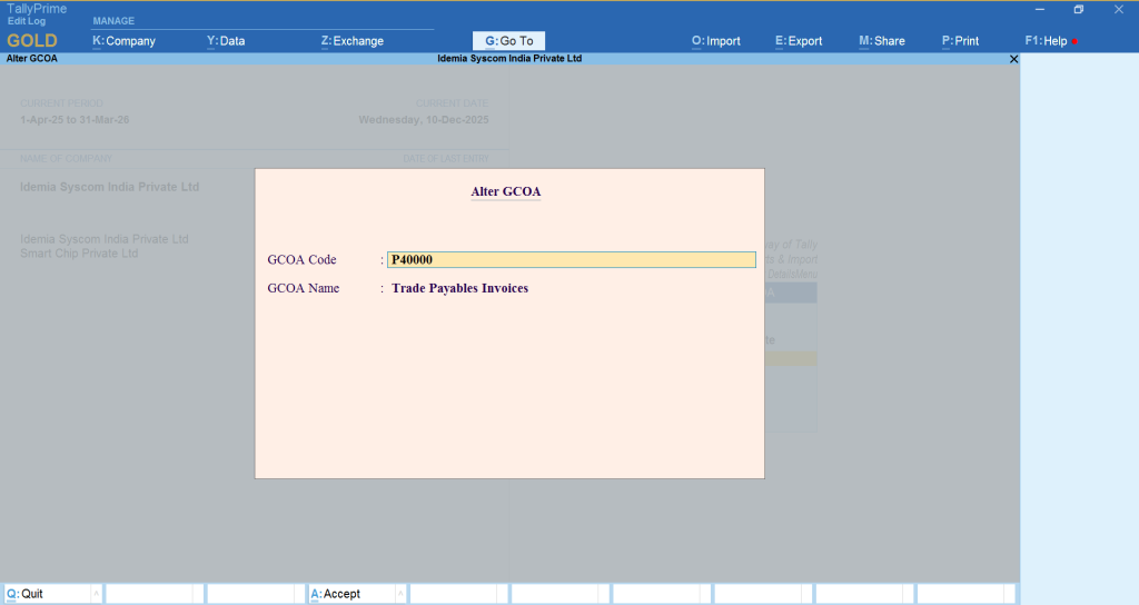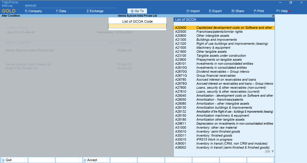 GCOA Master is our organization’s user-defined matrix containing a list of codes and names used to systematically classify all accounts. It ensures a standard and uniform structure for grouping ledgers across the company.