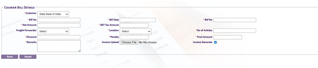 The Courier Bill Details page is used to capture, calculate, and generate courier-related billing information for SBI (State Bank of India).