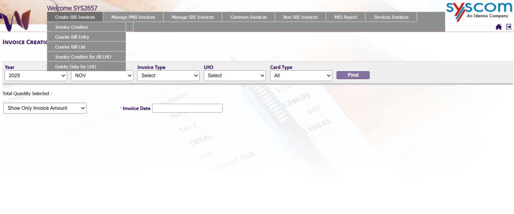 This screen is the primary workspace for creating and managing invoices in the WAVE application. It allows users to generate invoices based on selected criteria such as Year, Month, Invoice Type, LHO, and Card Type.